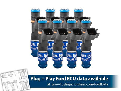 Mustang GT '86-'15 Fuel Injector Clinic Injector Set: 8 x 1650cc Saturated / High Impedance Ball & Seat Injectors. Utilizing the latest injector technology and featuring state of the art matching with Data Match Technology.  This injector set features easy to install, drop-in fitment with the factory style connector – no plug conversion required!