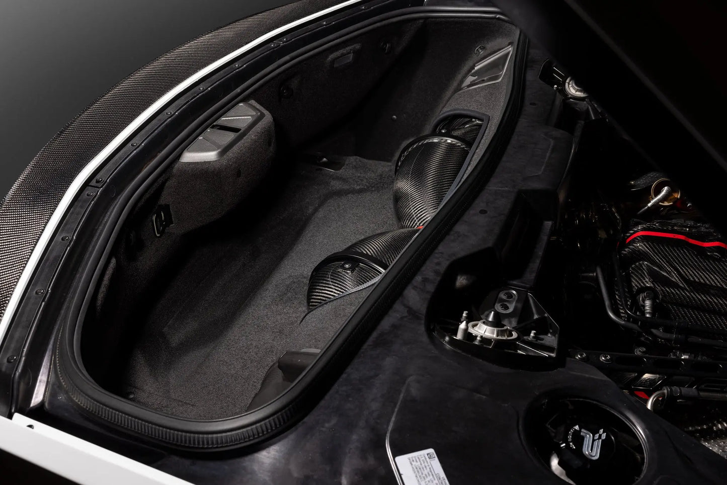 The C8 Corvette Eventuri intake sets a new benchmark on this platform for the highest performing intake and the largest internal volume available*. With the intake size and shape restricted by the OEM trunk panel, we redesigned it to allow for a larger intake. In doing so we also made it from clear Polycarbonate to allow the carbon intake to be on display when the trunk is open. Utilizing our Patented Venturi Housing concept, airflow is able to negotiate through the filters with a much less tortuous path thus reducing the drag of the system. Furthermore by increasing the overall volume in the intake, the flow capacity has also been increased allowing higher powered builds to maximize on performance gains. Intake air temperatures have been minimized by ensuring a sealed system, taking advantage of the OEM air feeds as well as using carbon fiber which has a low thermal conductivity coefficient across the wall thickness. The resulting system provides industry leading performance gains and a noticeable improvement in throttle response.