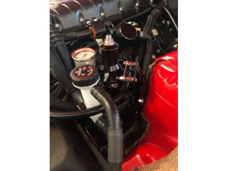 This is a single regulator fuel system that feeds the DI pump and fuel rails from a Y-block. Fuel is then regulated by the Aeromotive fuel pressure regulator on the driver's side and returned back to the fuel tank.
