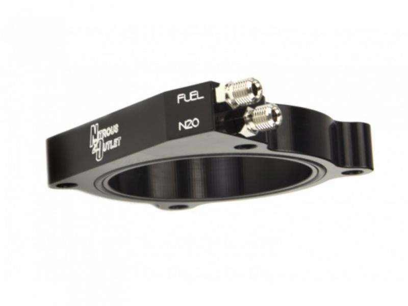 This Nitrous Outlet plate measures .75" thick and is anodized in gloss black and laser engraved to ensure it will look great for years. All Nitrous Outlet plates are CNC milled out of T6061 billet aluminum for long-lasting looks and performance. The plate has 6 individual fuel and nitrous discharge ports to ensure total saturation of the incoming air charge and the best possible cylinder to cylinder distribution for a plate system. The rebuildable .122 Nitrous and .177 Fuel Solenoids have CNC machined stainless steel bases and powder-coated steel cans to ensure years of durability.