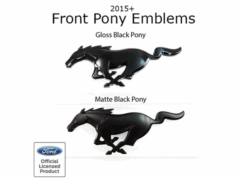 Replace the factory S550 Mustang chrome Pony front emblem with the better looking black emblems. The Black Pony fits in the front Grill. Fits all: 2015-2016 Ford Mustang Coyote S550 Shelby Roush Saleen & Steeda Vehicles. Ford Officially Licensed. Emblem matches the factory Ford OEM emblems. Choose either a Gloss or Matte Finish. The Black Pony Front Emblem uses the OEM locator holes in the grille just like the chrome emblems. 3M Adhesive is Included for a Simple 10 minute install.